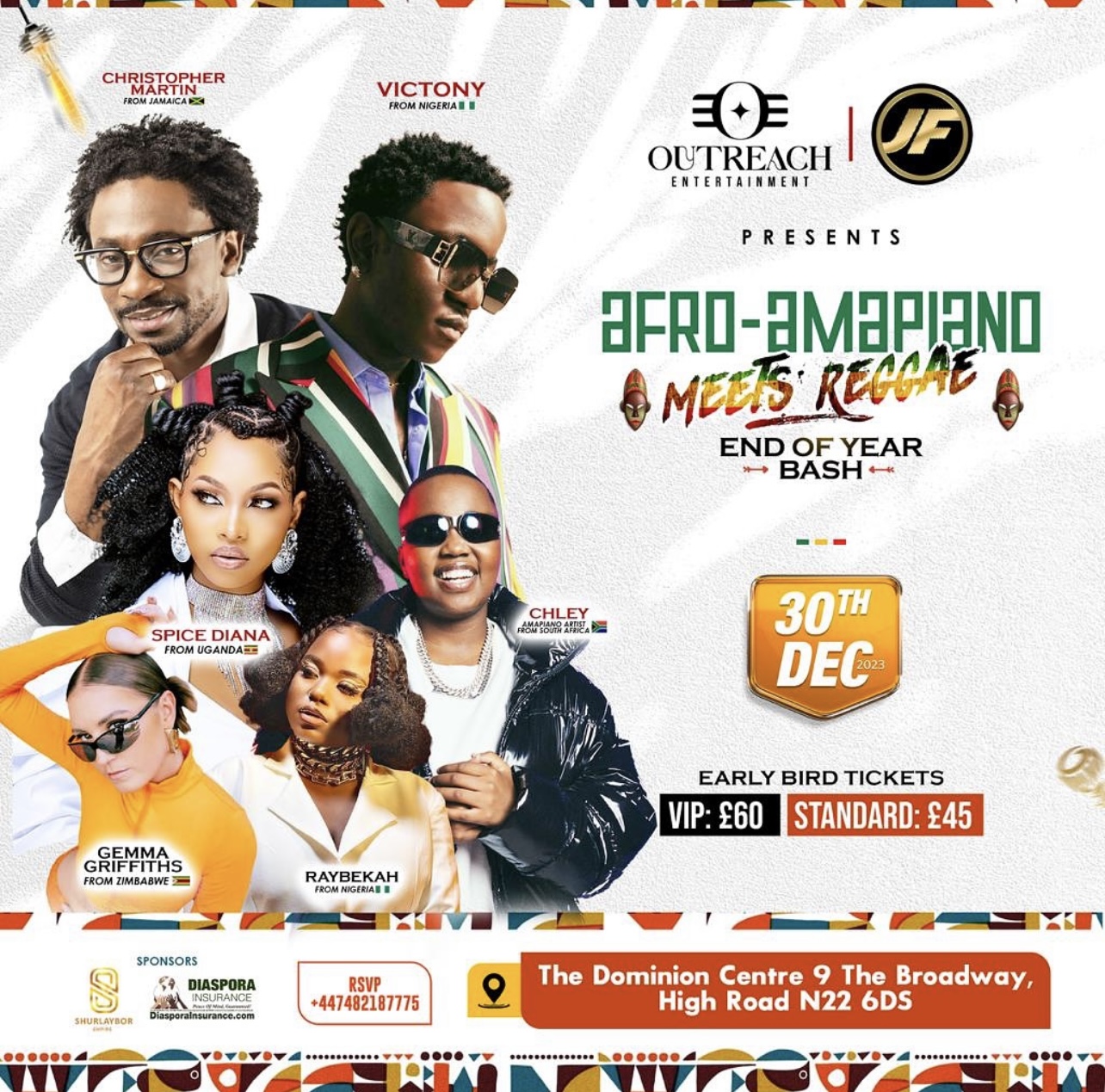 On Saturday, December 30, 2023, at 7:00 PM GMT, London will come alive with the vibrant beats of AfroBeats, Amapiano, and Reggae Dancehall, as Christopher Martin from Jamaica, Gemma from Zimbabwe, Chley, and DJ Toby representing Amapiano acts from South Africa, join Spice Diana in a star-studded lineup. The event promises a night of non-stop music, dancing, and celebration.