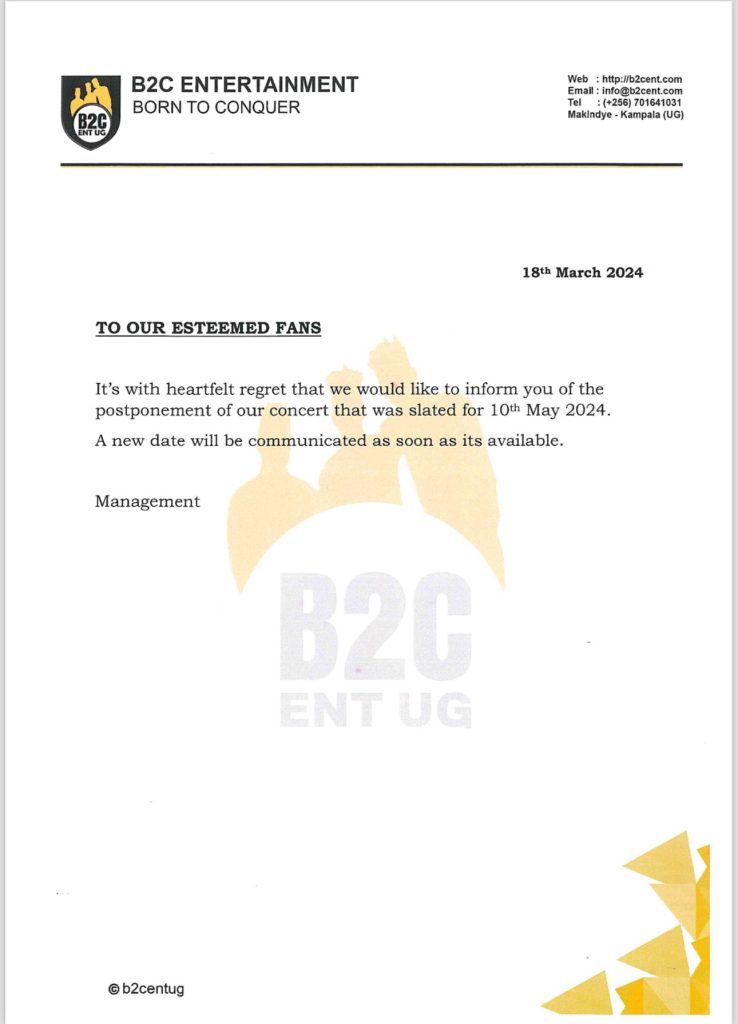 In a statement released by B2C, they expressed their sincere regret for the postponement, stating, “It’s with heartfelt regret that we would like to inform you of the postponement of our concert that was slated for 10th May 2024. A new date will be communicated as soon as it’s available.”